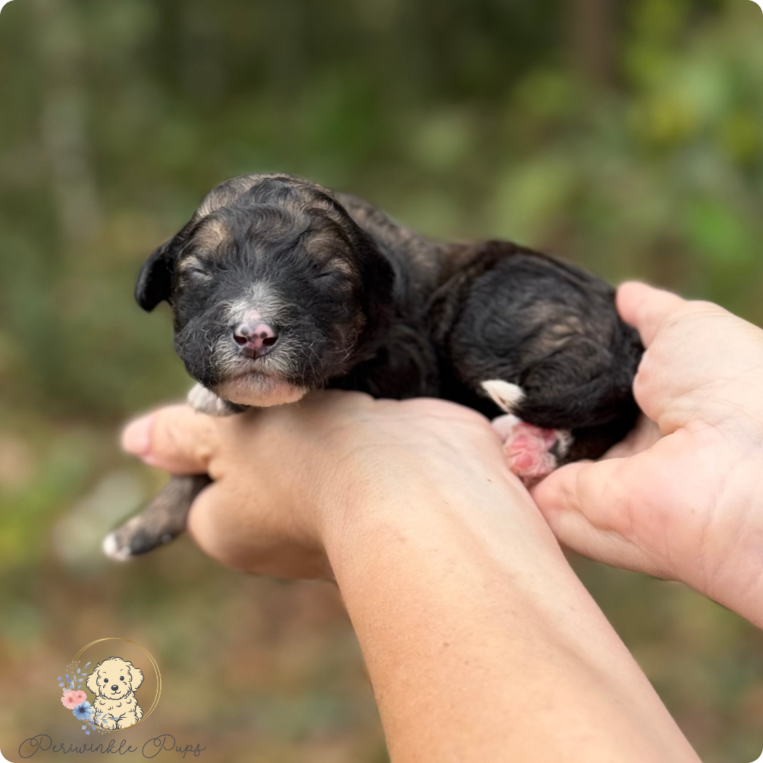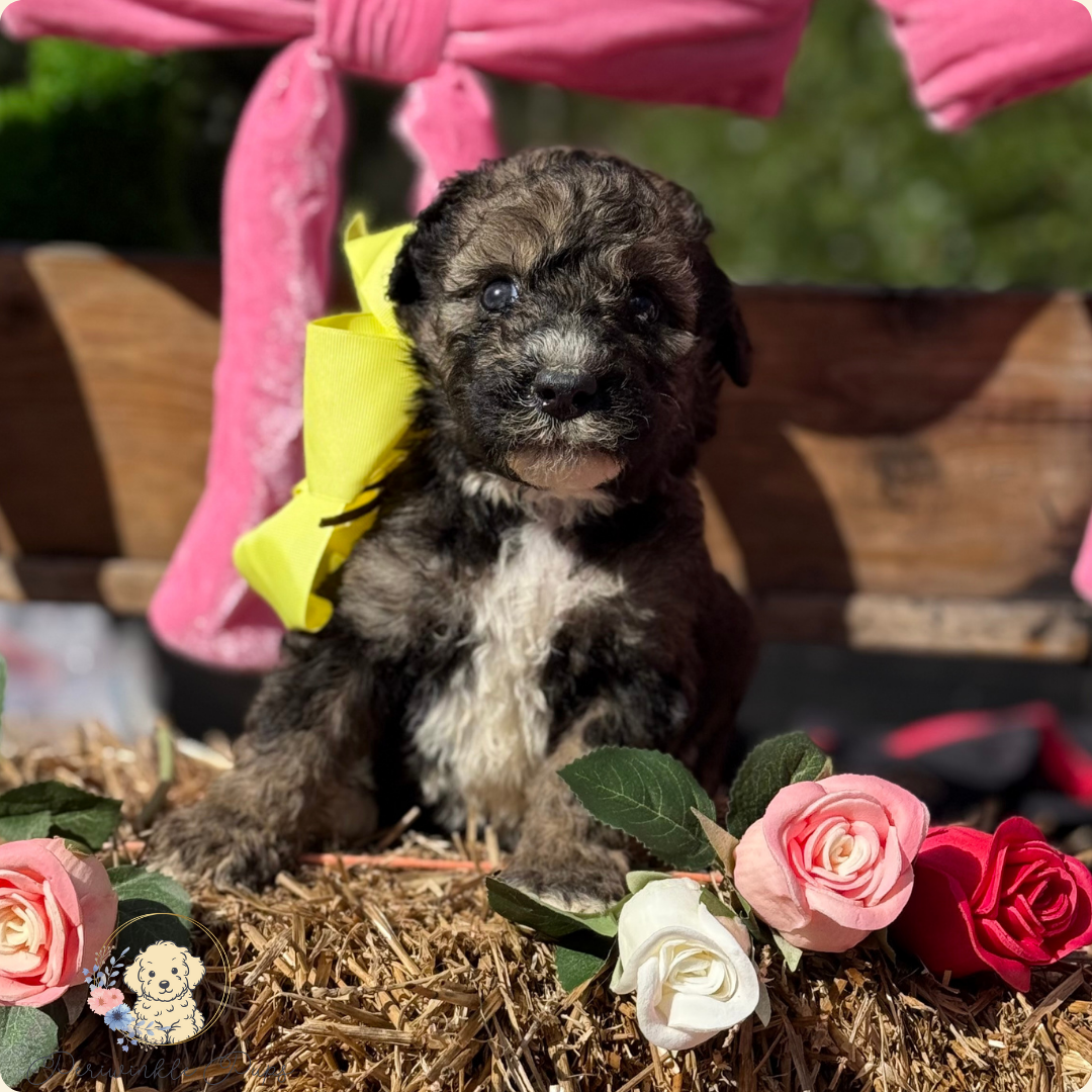 Midnight is a soft-hearted sweetheart with a lovely sable abstract coat. Her calm, thoughtful temperament makes her a wonderful companion for families or first-time doodle owners. She’s intelligent, loving, and happiest right by your side.